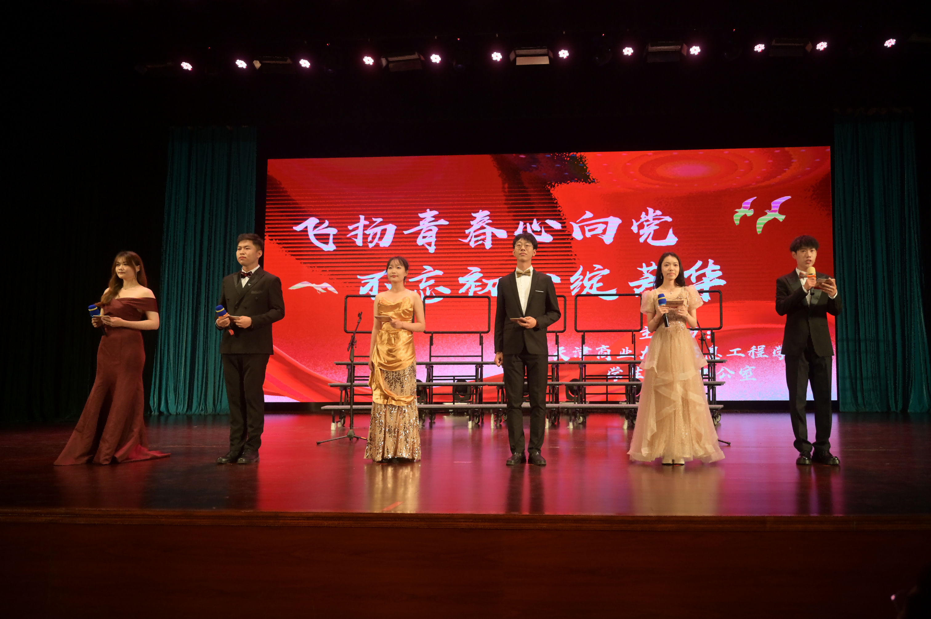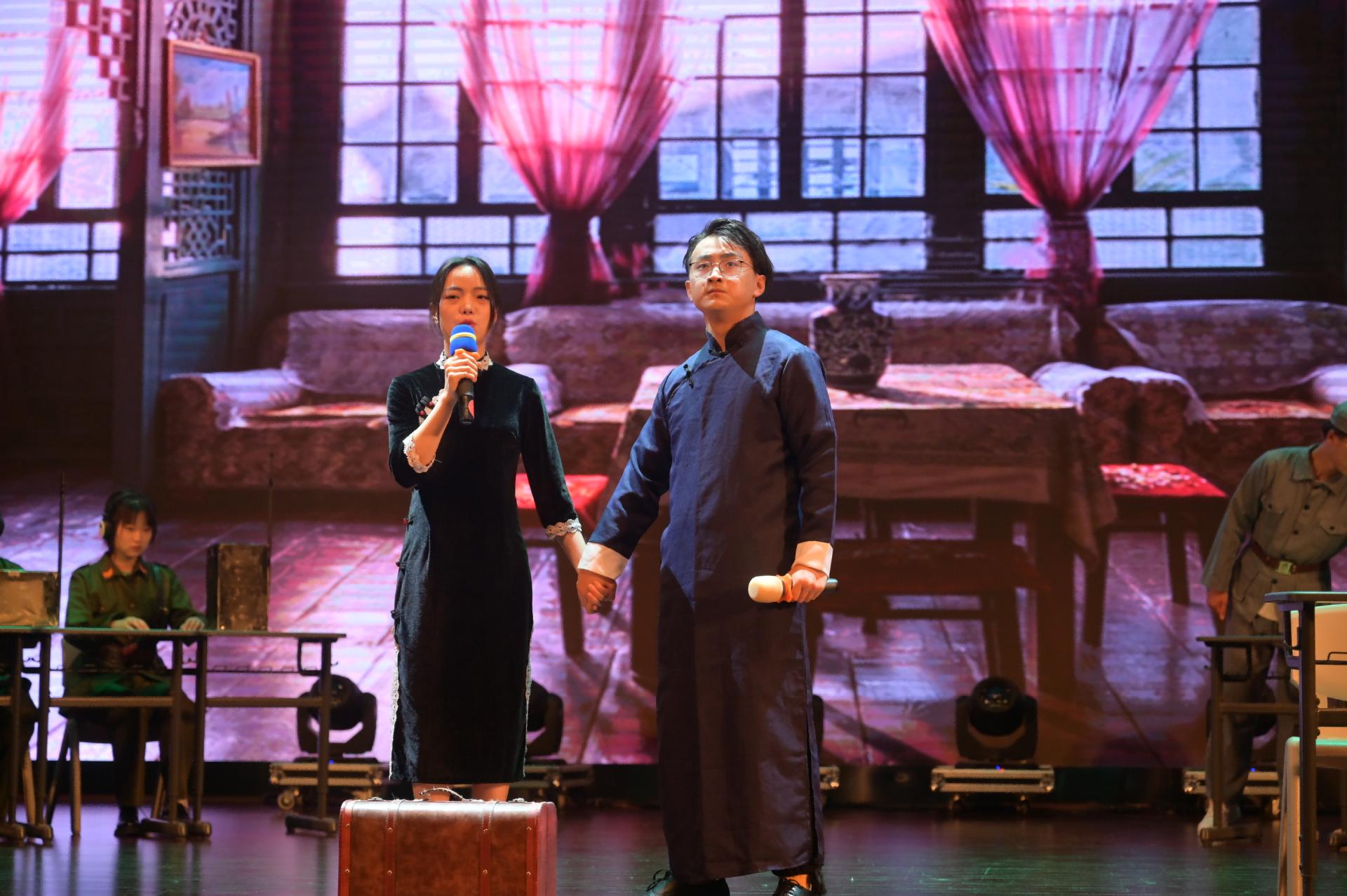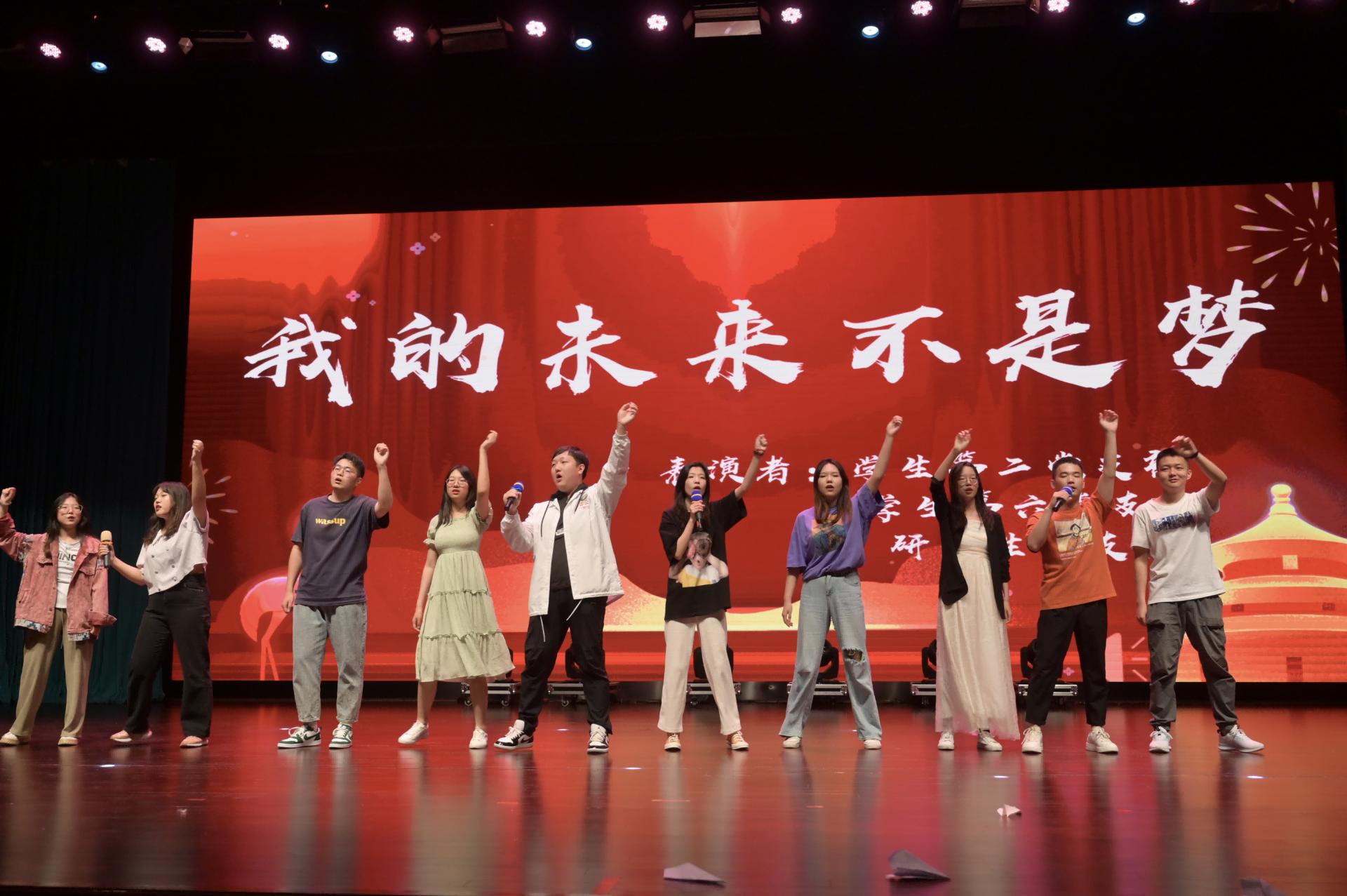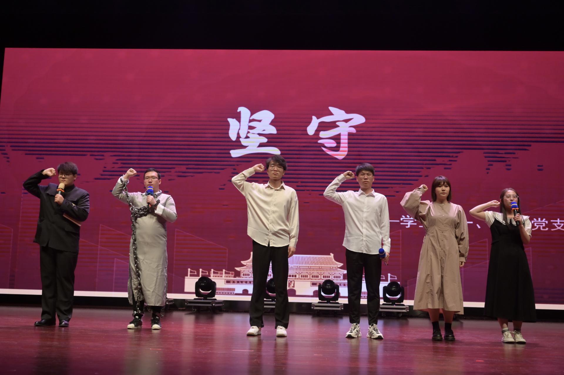 晚会分为四个篇章,首先由员工以班级为单位唱响青春之歌,《少年中国说》《国家》《我和我的祖国》《强军战歌》《歌唱祖国》,熟悉的旋律,演绎时代的乐章,展现新时代青年的家国情怀;教职工代表精心准备的朗诵《心向党 启新程》和歌曲《我们走在大路上》铿锵有力、饱含深情,激发了炽热的爱国情感与热忱的赤子之心。民族舞《日出》将柔韧与力量融合,生动展现了民族特色,舞出了民族团结一家亲的精神风貌。员工党支部分别带来情景剧朗诵《坚守》、手语舞蹈《少年》、歌曲《我的未来不是梦》,表达了员工党员浓浓的爱党爱国之情,展现出员工党员良好的精神风貌。最后,由员工党建办公室带来的话剧《永不消逝的电波》收获了现场观众热烈的掌声。