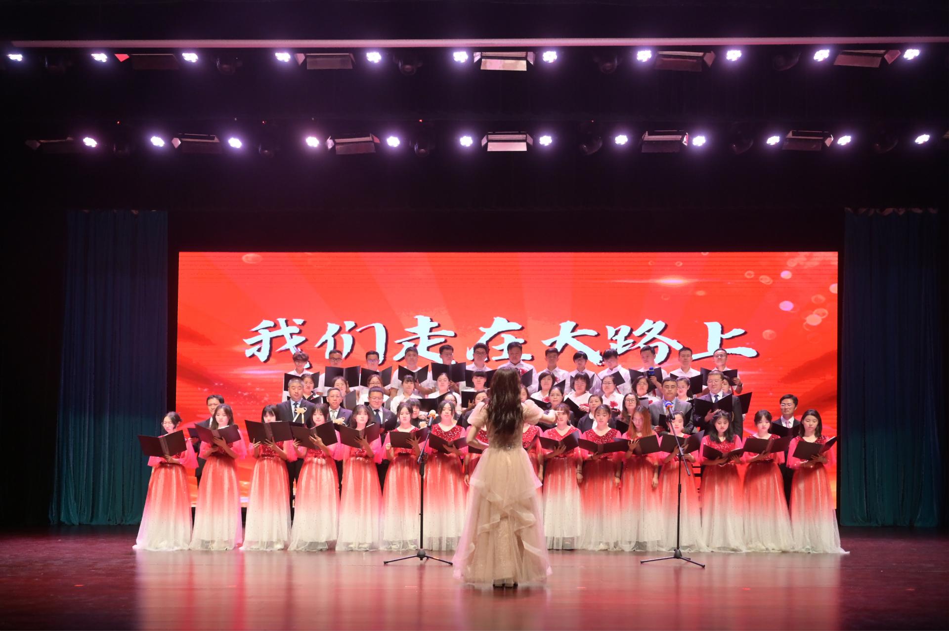 教职工代表朗诵《心向党 启新程》并演唱歌曲《我们走在大路上》